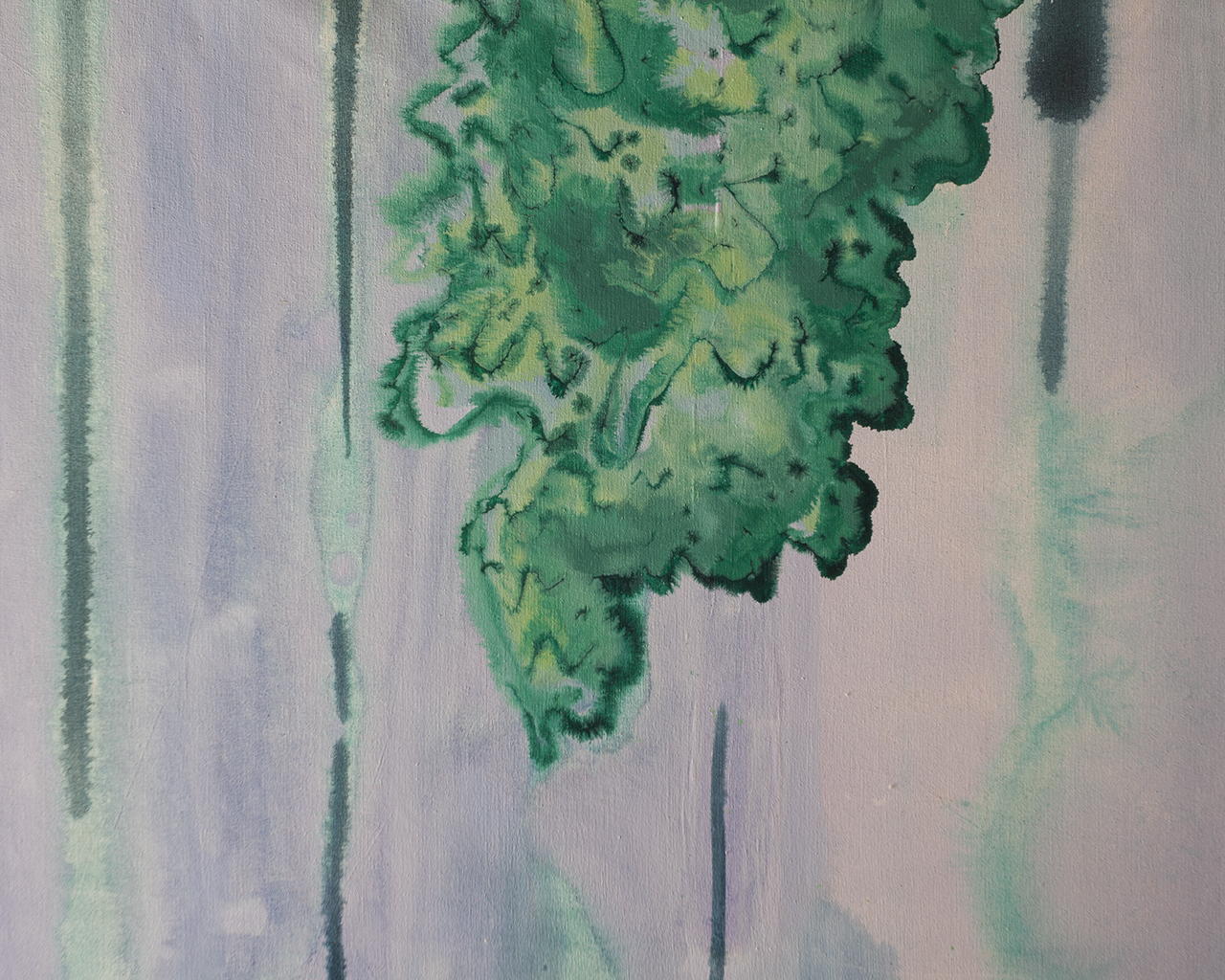 In a nod to classic t-shirt craft, the tie-dyed canvases provide a visually compelling ground for overlayed landscapes, aesthetically swaying between old foxed paper and psychedelic portals. The accompanying watercolors mark a starting point for uncanny anthropomorphized trees and transgressive interactions between characters and their surroundings.