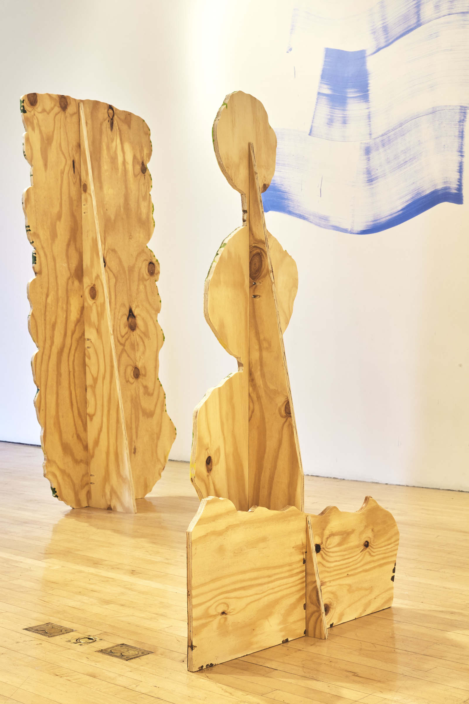 Skidmore explores the relationship between houseplants and paintings, both often brought into domestic spaces to act as windows into other worlds outside. He’s interested in paintings and plants as props—objects positioned to provide support for things they’re not actually a part of. Like theater flats, both in construction and function, his three-dimensional paintings highlight the tenuous relationship between fantasy and reality. They exploit the fragility of the seams between belief and truth.
