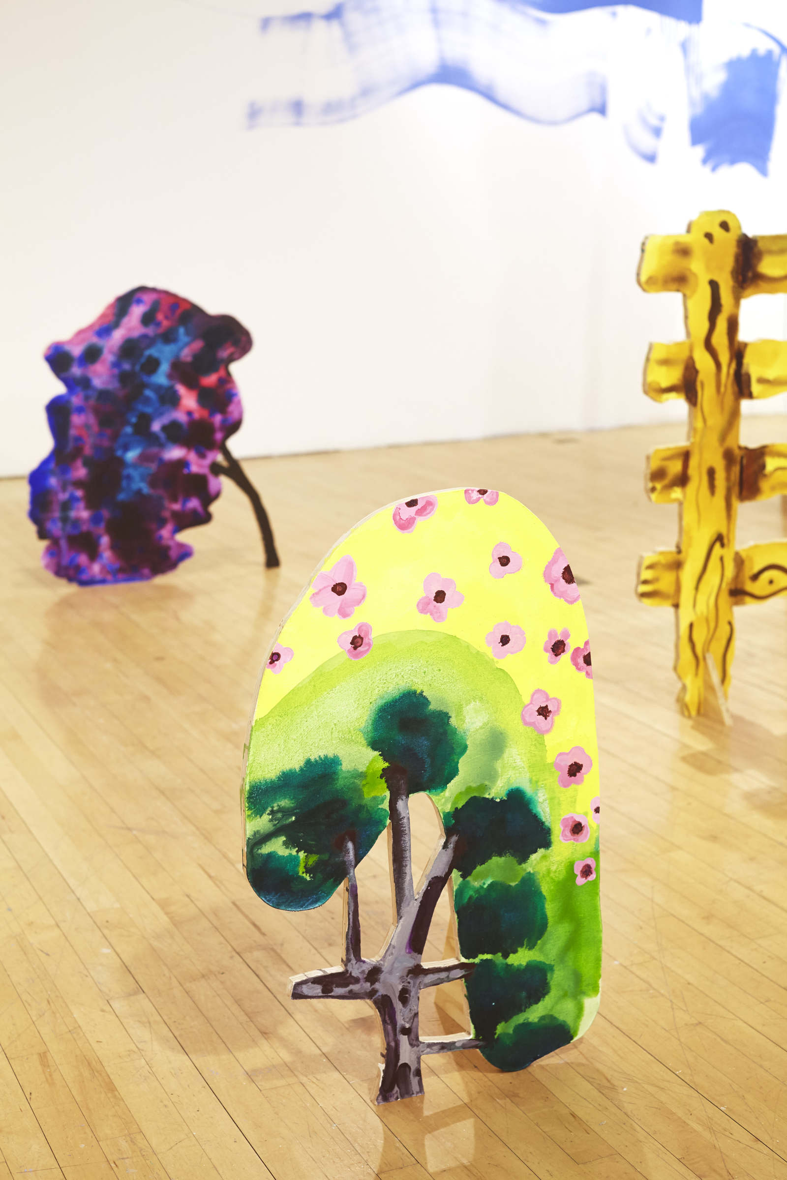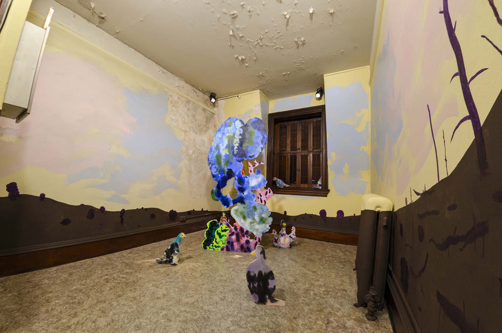 Clayton Skidmore is having a Plant Sale, and you’re invited. For three weeks, he’s transforming Life Lessons Garage into a plant shop, filled with his paintings of brightly colored, cartoonish, and apocalyptic plants. Like a supersized pop-up book brought to life, the space will be overtaken with cut-out plywood paintings, surrounded by large-scale canvas murals attached to the walls.